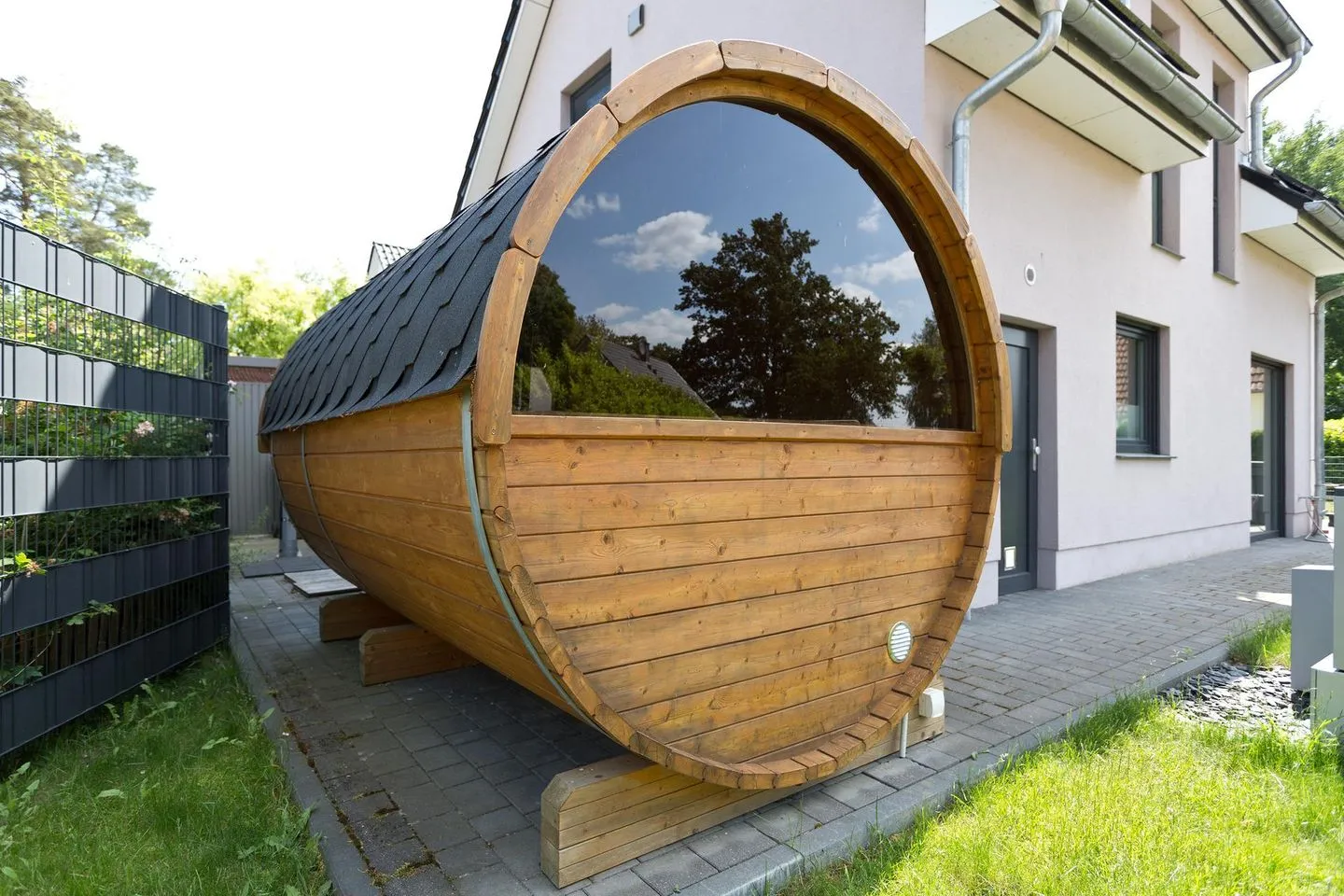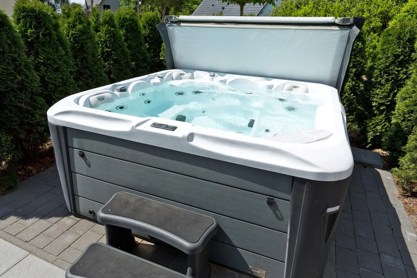 Im eingezäunten Außenbereich befindet sich ein Whirlpool, sowie eine Außendusche, eine Faßsauna, ein Fahrradabstellraum und ein Gerätehaus, sowie ein Steinaußengrill und die entsprechenden Außenmöbel. Zusätzlich vorhanden ist eine Ladestation bis zu 11 KW.