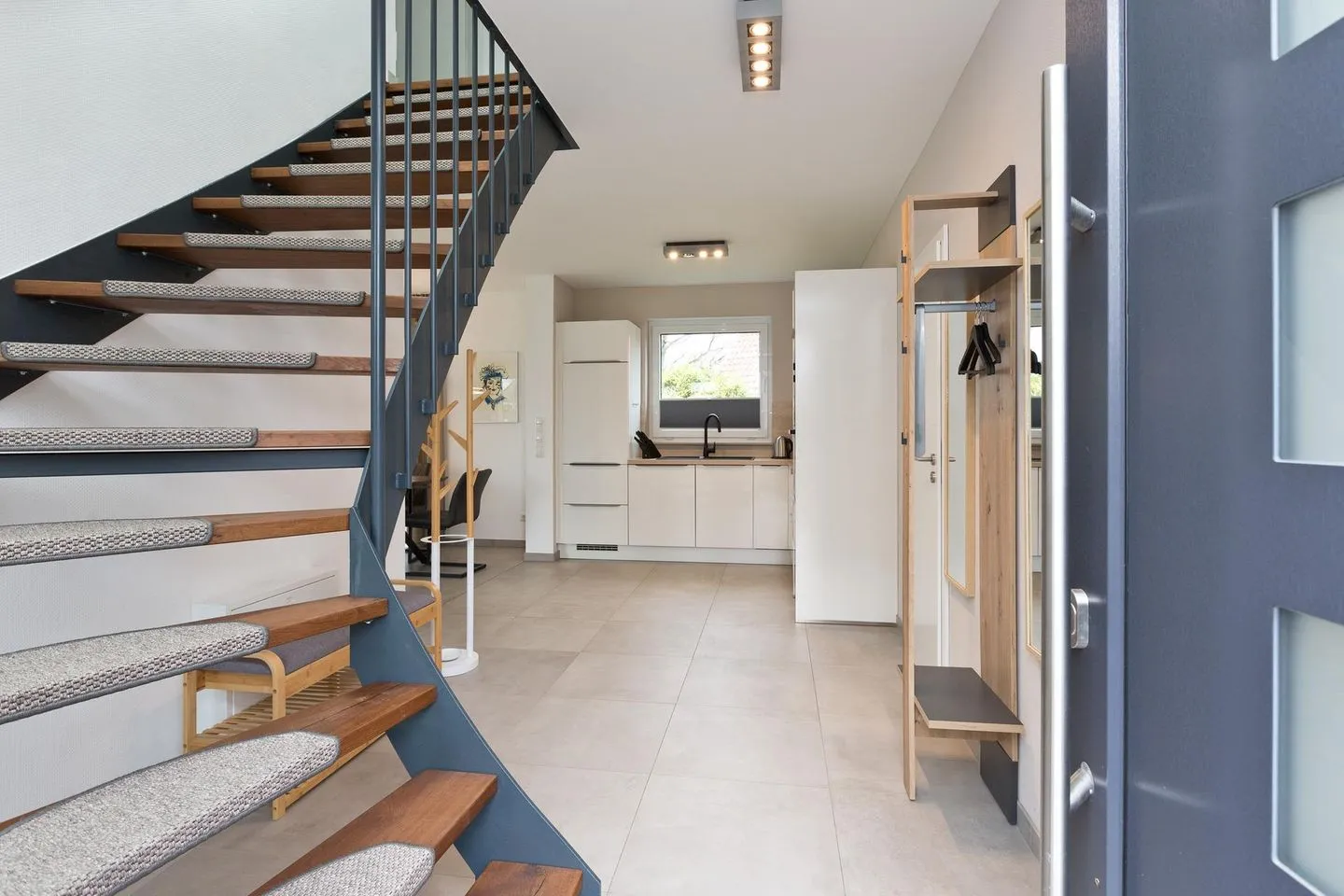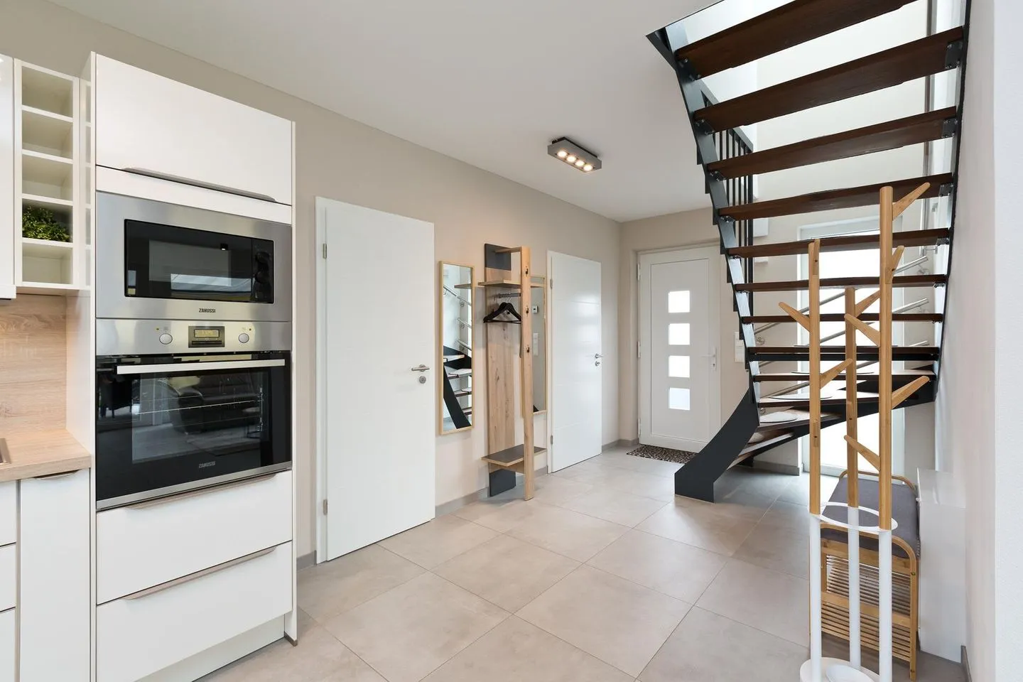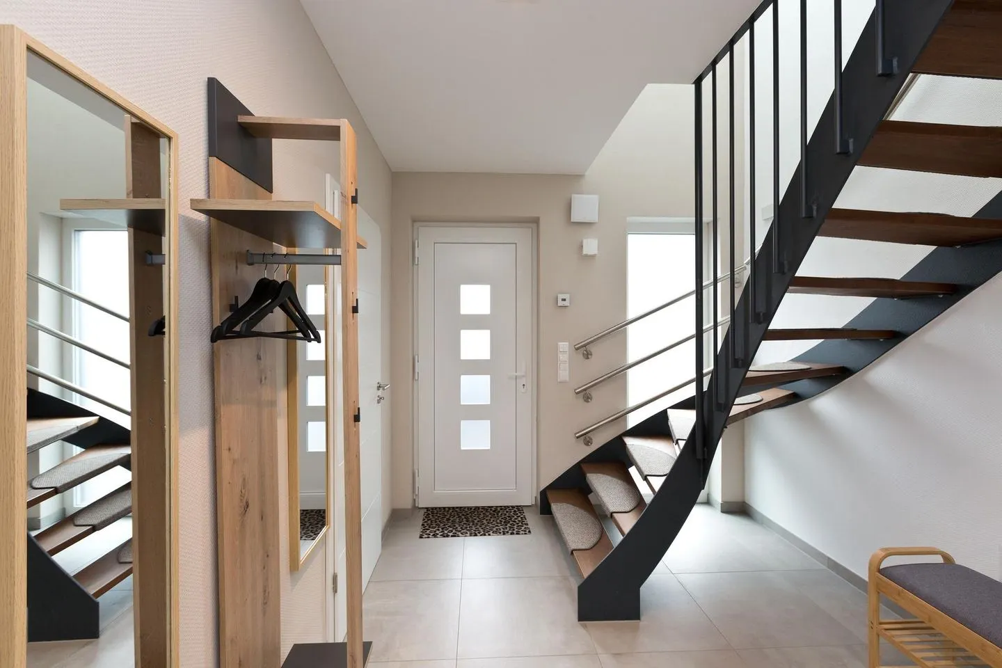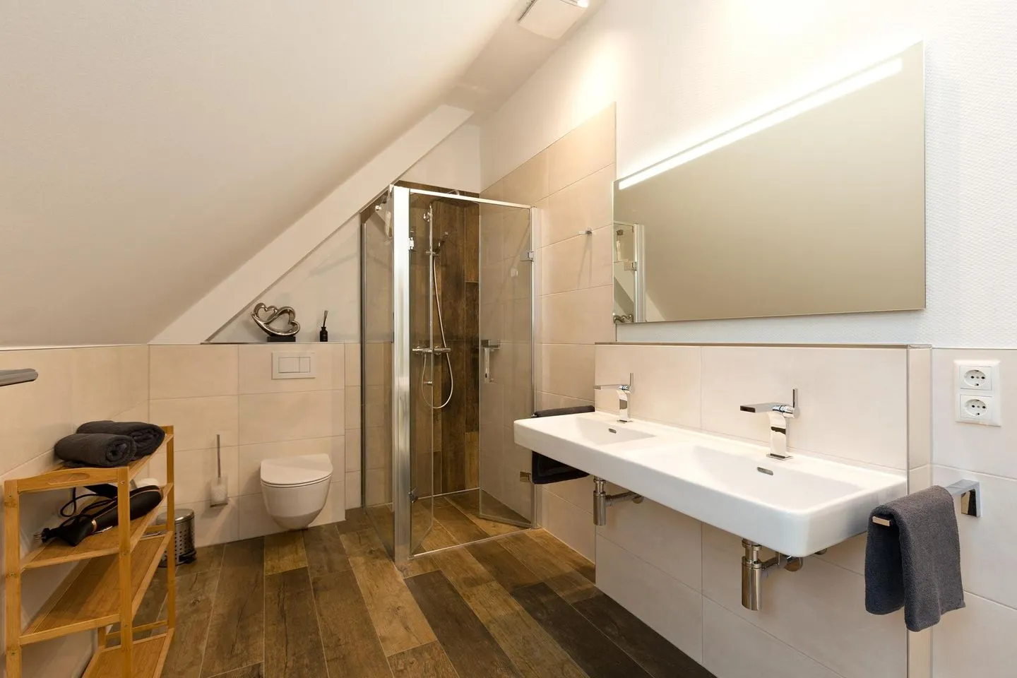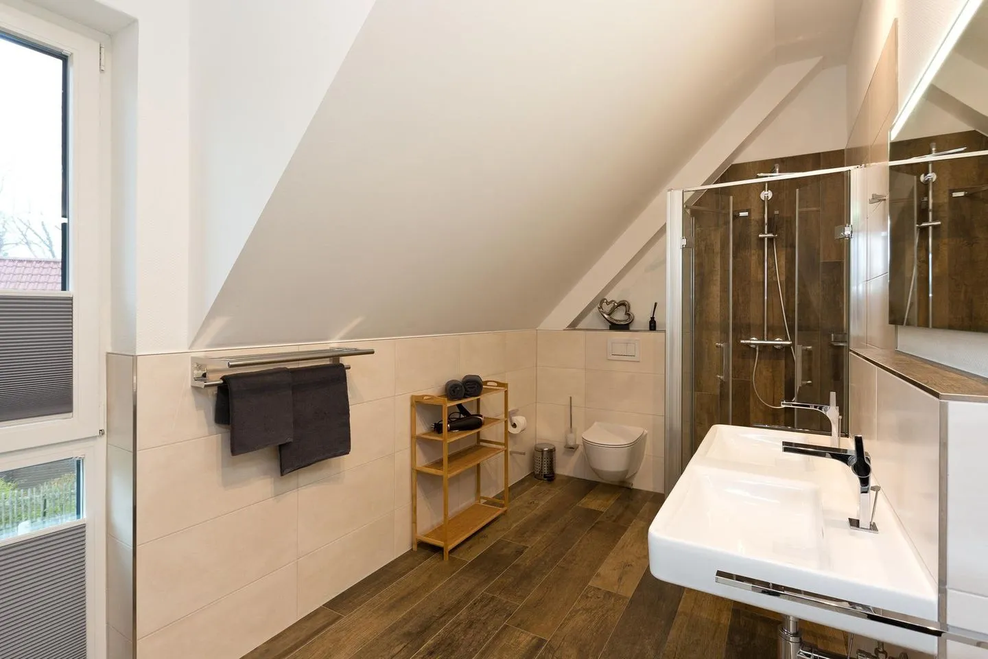 Gleichzeitig befindet sich im Erdgeschoss eine Garderobe mit Sitzbank, Garderobenständer, Spiegel und das Gäste WC mit einer bodengleichen Dusche, WC und Waschtisch, hier ist das Besondere, dass Sie durch die eingebaute Außentür gleich in den offenen Bereich nach draußen gelangen und dort die Außendusche und die Sauna nutzen können.