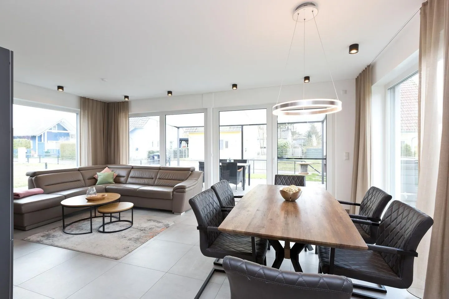 Große bodentiefe Fensterelemente öffnen den kompletten Wohnbereich in den Garten. Das Haus bietet neben der Fußbodenheizung auch eine Kühlung für alle Räume an. Zusätzlich sind alle Räume mit eine integrierter Wohnraumbelüftung versehen die ein fantastisches Raumklima erzeugt.