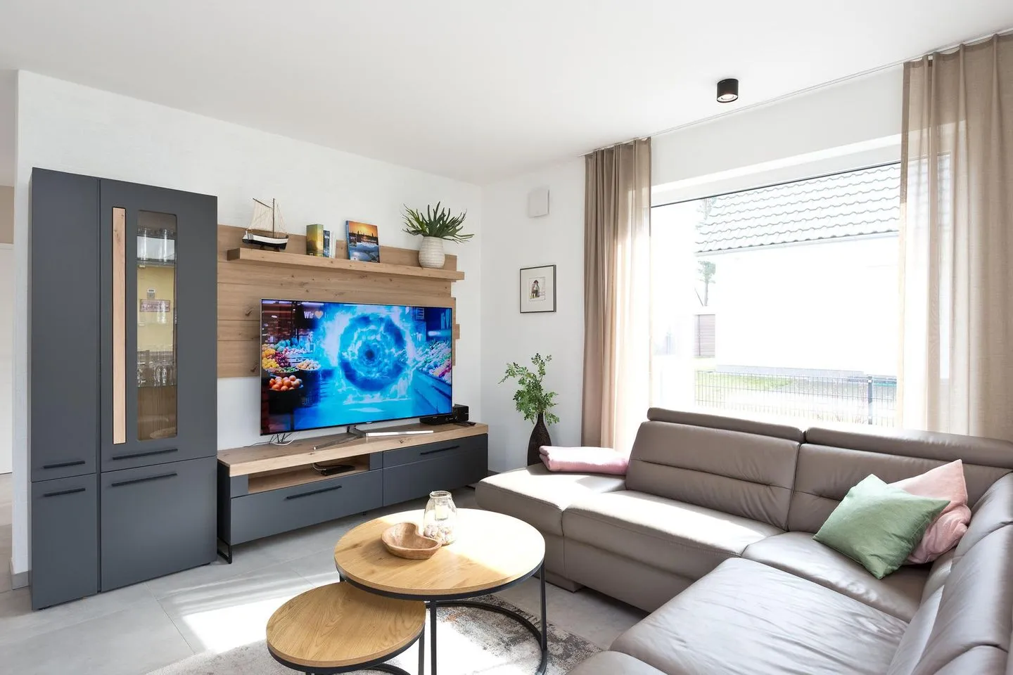 Im Erdgeschoss befindet sich der großzügige Wohn-Küchen und Essbereich. Hier erwartet Sie eine gehobene und exklusive Ausstattung mit einem Ecksofa, Couchtisch einer Wohnwand und einem 65 Zoll Fernseher, sowie Internetradio und einer 5G - Wlan Box (inkl. unbegrenzte Flat) auf allen Räumen verteilt. Hier haben Sie die Möglichkeit mit Ihren Lieben gemütliche Fernsehabende zu verbringen. Die Küche lässt ebenfalls keine Wünsche offen, hier befindet sich alles was man benötigt um ein tolles Essen zu zaubern und seine Lieben zu verwöhnen. Die Küche besitzt eine Nespressomaschine und eine Filterkaffeemaschine, Thermoskanne, Kaffeedose, Wasserkocher, Toaster, Schneidebretter, Handmixer, Küchenwaage, Sparschäler, Zitronenpresse, 60 teiliges Besteckset, 12 teilige Essgeschirrset, 12 teiliges Kaffeegeschirrset und ausreichend Gläser.