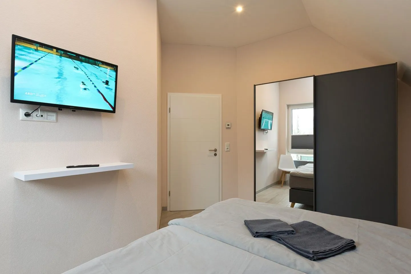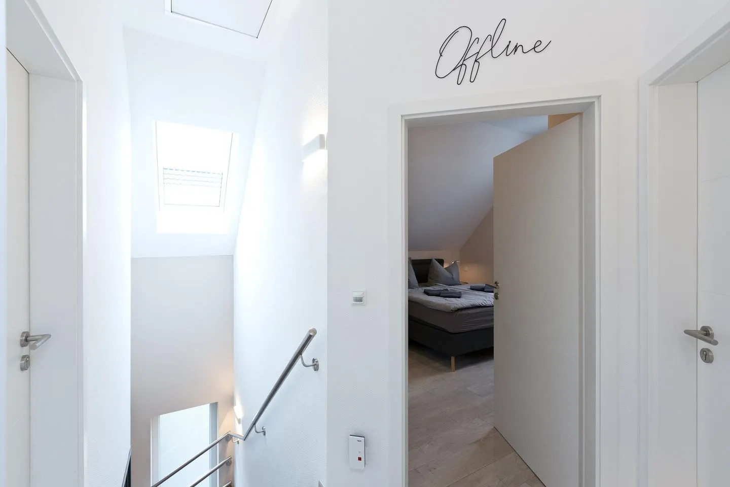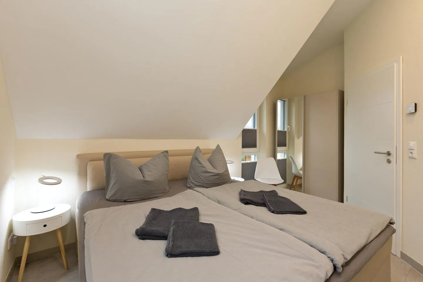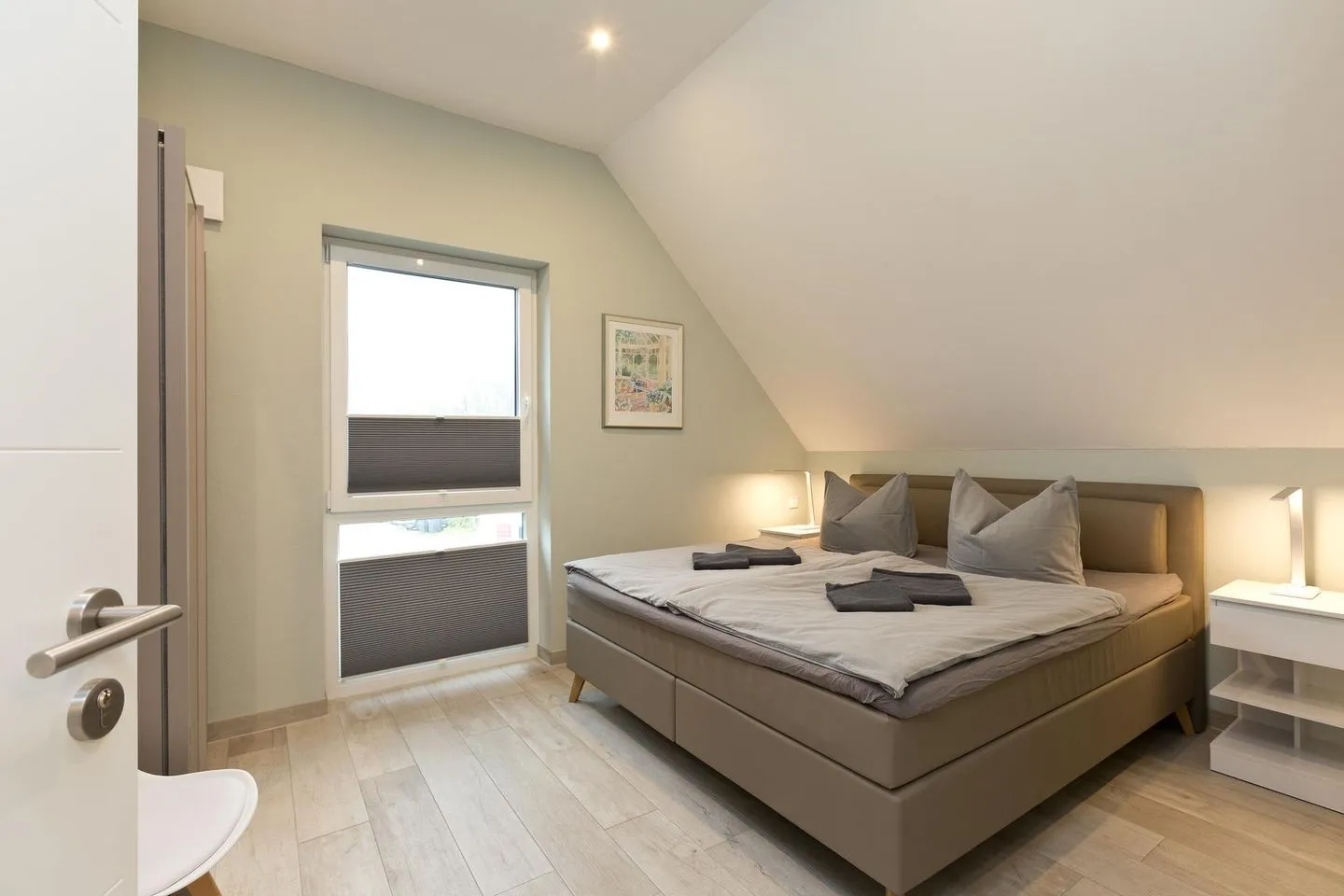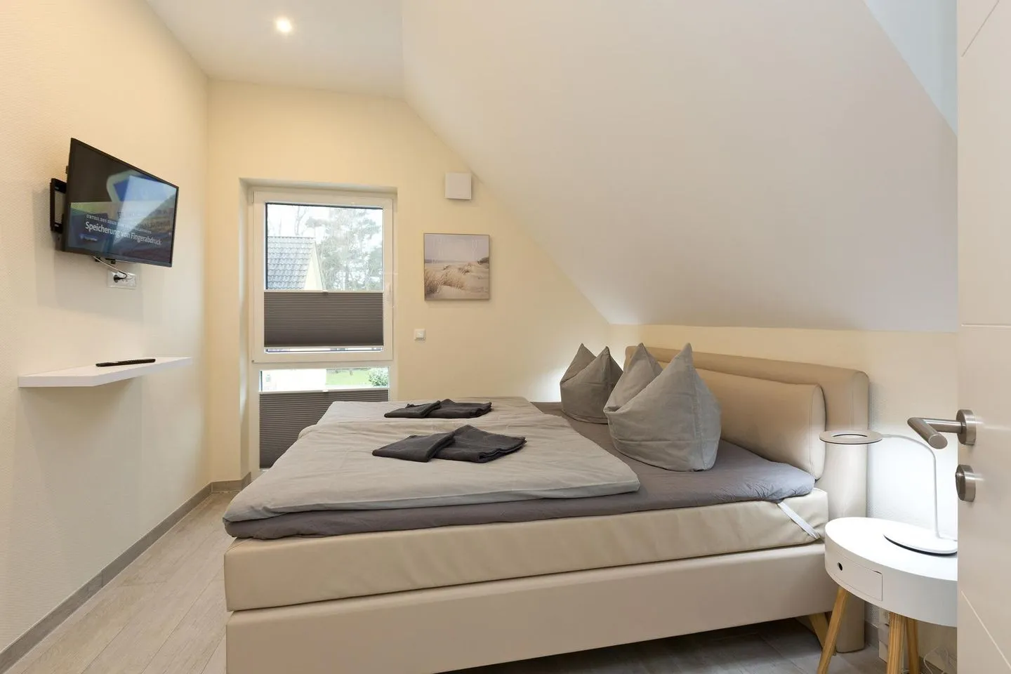 Im Obergeschoss befinden sich die Schlafzimmer, alle sind mit einem Boxspringbett ,Matratzenschoner sowie Zudecken und Kopfkissen ausgestattet. Nachttische und Nachttischlampen bieten Ihnen die Möglichkeit in Ruhe ein Buch zu lesen oder Sie nutzen die im Schlafzimmer an der Wand befestigten TV Geräte um den Abend ausklingen zu lassen.