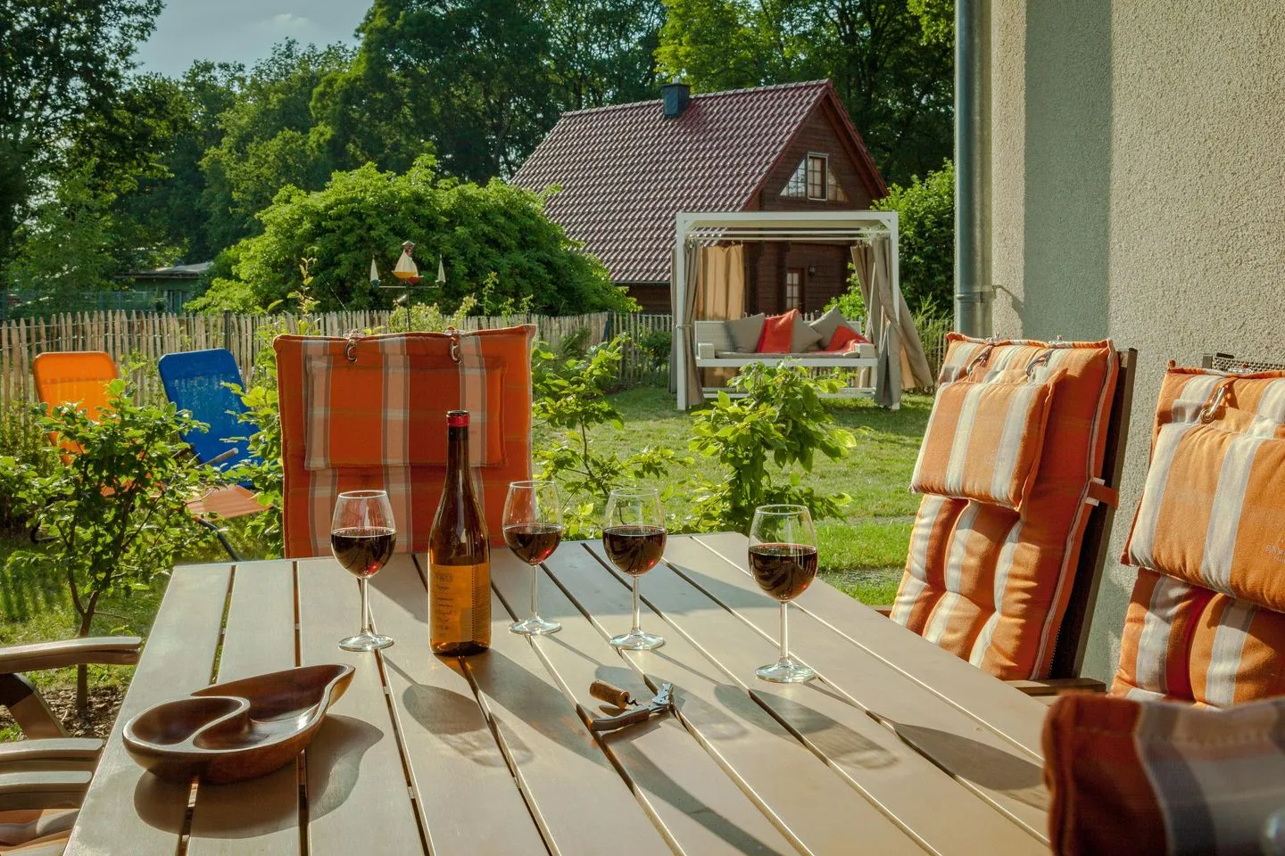 Im komplett umzäunten Garten warten schon Terrassenmöbel, Sonnenliegen und eine Hawaii-Schaukel auf