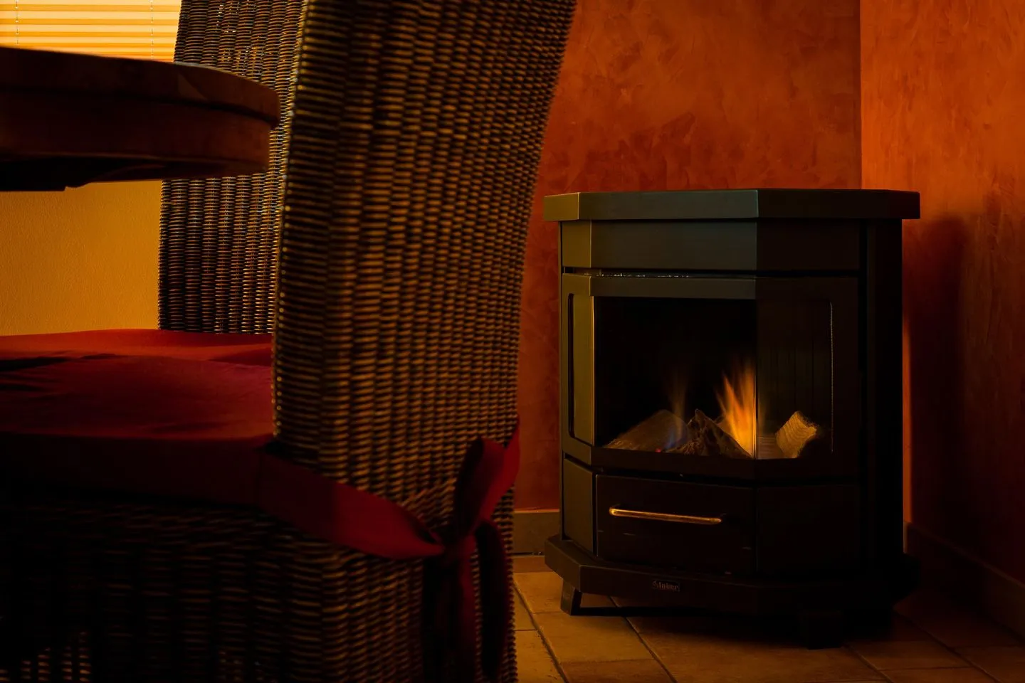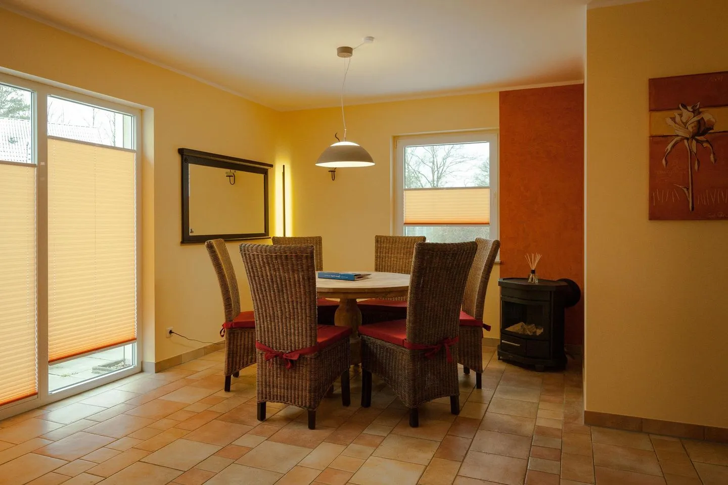 Für Spieleabende eignet sich zudem der große, runde Esstisch ideal. Ein Gaskamin sorgt auf Knopfdruck
