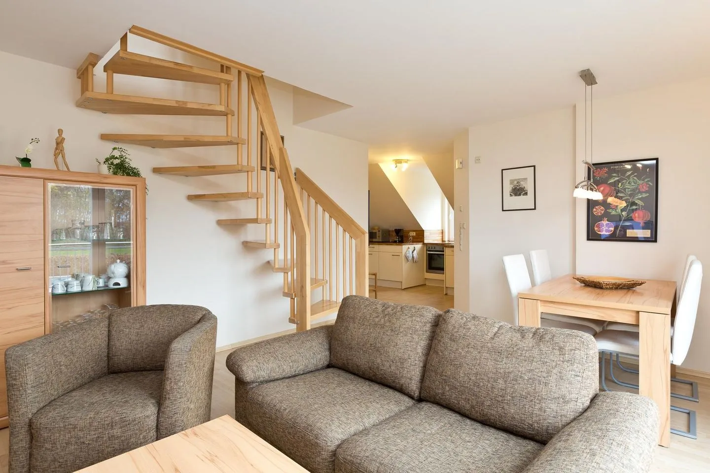 Die Ferienwohnung befindet sich im Obergeschoss der Villa Royal . Mit einem offenen Wohn - und Essbereich, sowie einer Küche, einem Bad und zwei Schlafzimmern. Sie bietet ausreichend Platz für 4 Personen. Im Erdgeschoss der Wohnung befindet sich der Wohn- und Essbereich, ein Badezimmer mit Sauna, Dusche und WC und ein Schlafzimmer mit Doppeltbett und Kleiderschrank. Die voll ausgestattete Küche bietet zahlreiches Zubehör und Elektrogeräte. Der Wohnbereich ist mit einem gemütlichen 3-Sitzer Sofa, Sessel und einem Elektro-Kamin ausgestattet, der für gemütliche Abende sorgt .Über den Wohnbereich gelangen Sie auf den großzügigen möblierten Balkon.