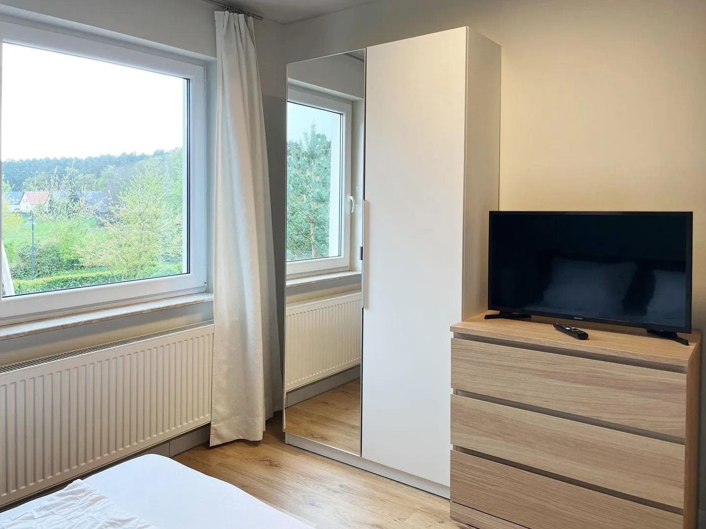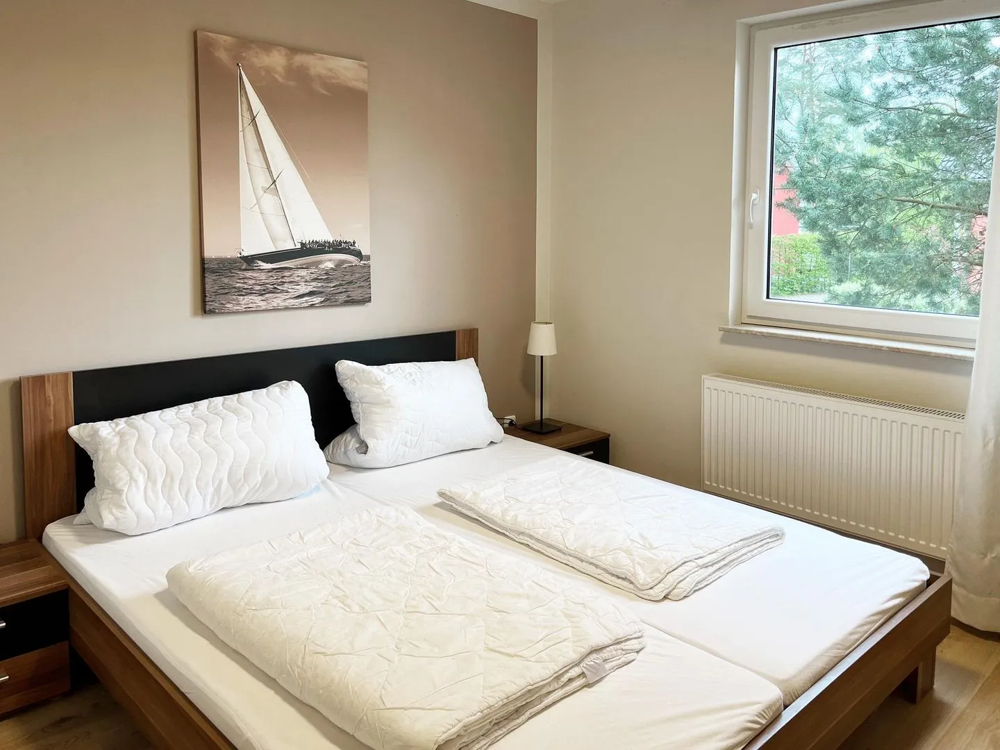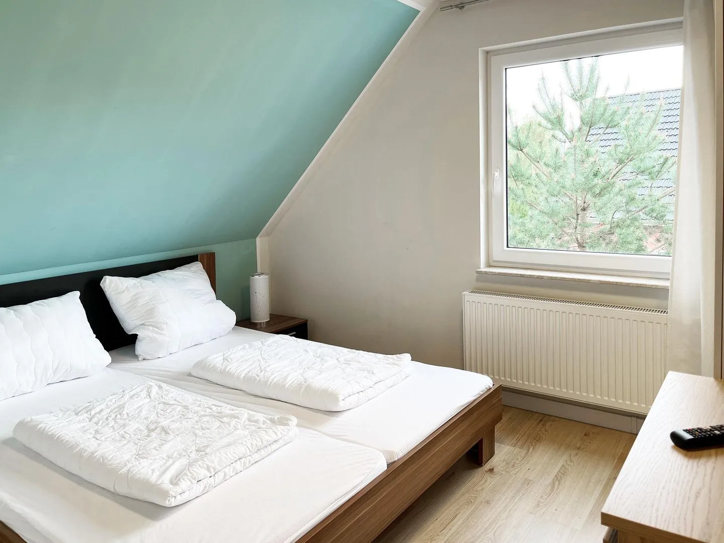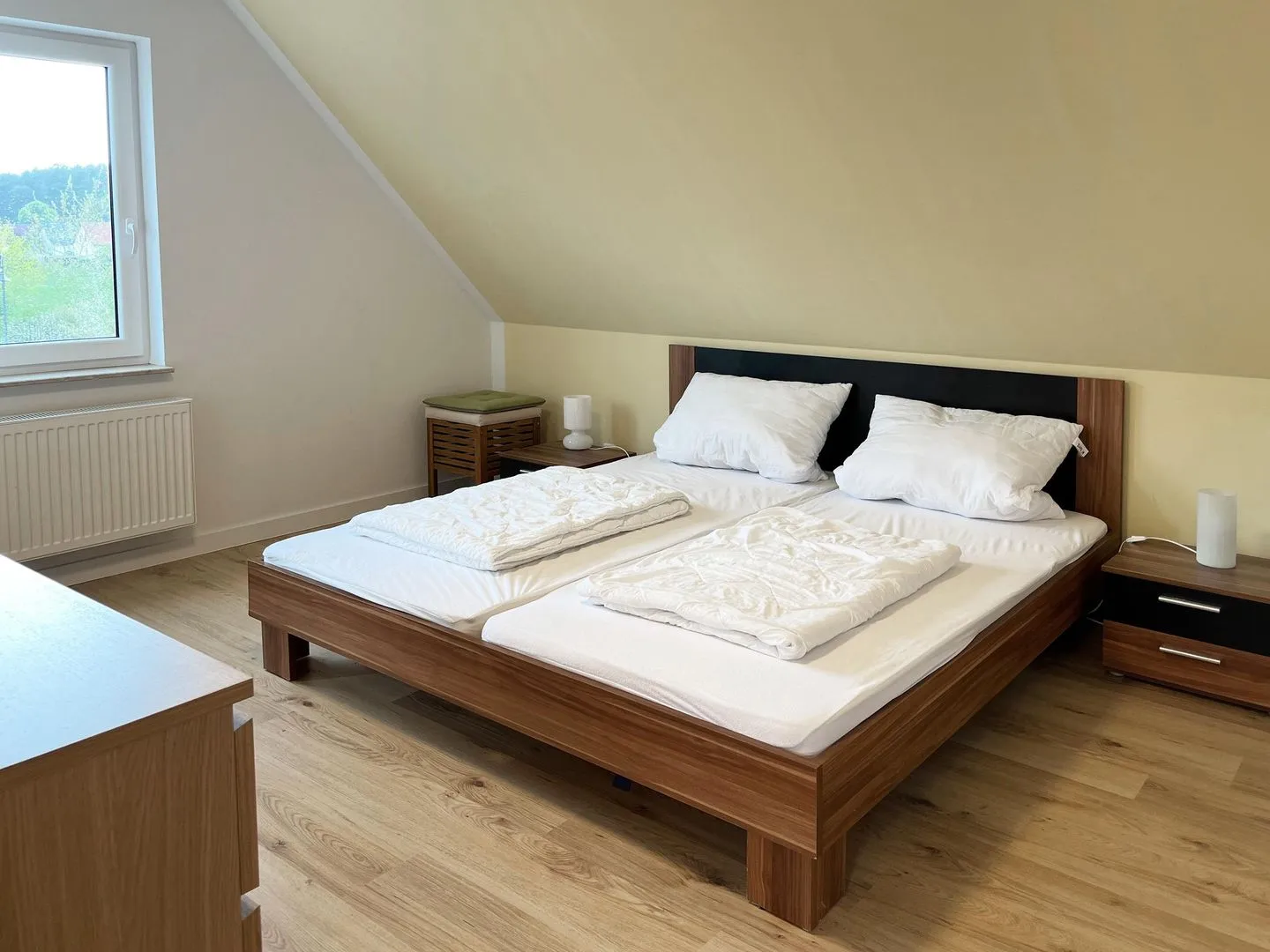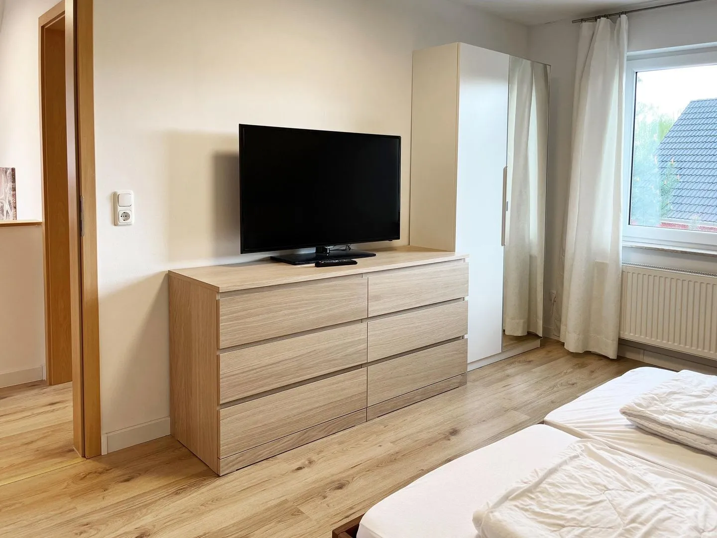 Im Erdgeschoss befindet sich der gemütliche Wohnraum mit Koch-/ Essbereich, ein zweites Bad mit Dusche, WC und Waschbecken und ein Schlafzimmer mit Doppelbett, Schrank und Kommode. Die drei Schlafzimmer im Obergeschoss sind alle mit Doppelbett, Schrank und Kommode ausgestattet, darüber hinaus verfügt jedes Schlafzimmer über einen modernen LCD-Flachbildschirm. Das Hauptbad im Obergeschoss ist mit WC, Waschbecken, sowie Badewanne und Dusche ausgestattet. Der Außenbereich bietet eine große überdachte Terrasse mit Sitzmöbeln, Sonnenschirm und Grill.