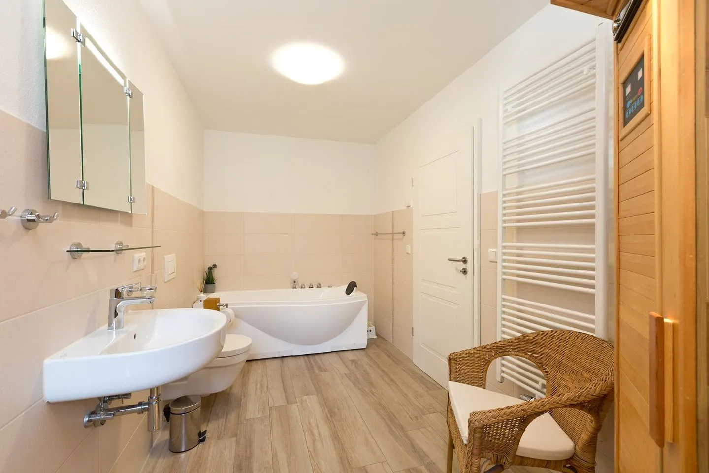 Die Ferienwohnung liegt im Erdgeschoss und bietet Platz für 4 Personen. Ausgestattet mit 2 Schlafzimmern, 1 Gäste-WC mit Waschmaschine, 1 Wohnzimmer mit Flachbildschirm, Stereoanlage mit DVD-Player, sowie eine Küche mit vielen hochwertigen Elektrogeräten (Spülmaschine, Kühl/Gefrierschrank, Kombi-Backofen, Ceranfeld usw.). In dem großzügigen Bad befindet sich ein WC, Waschbecken, Dusche, Whirlpool und Infrarot - Wärmekabine.