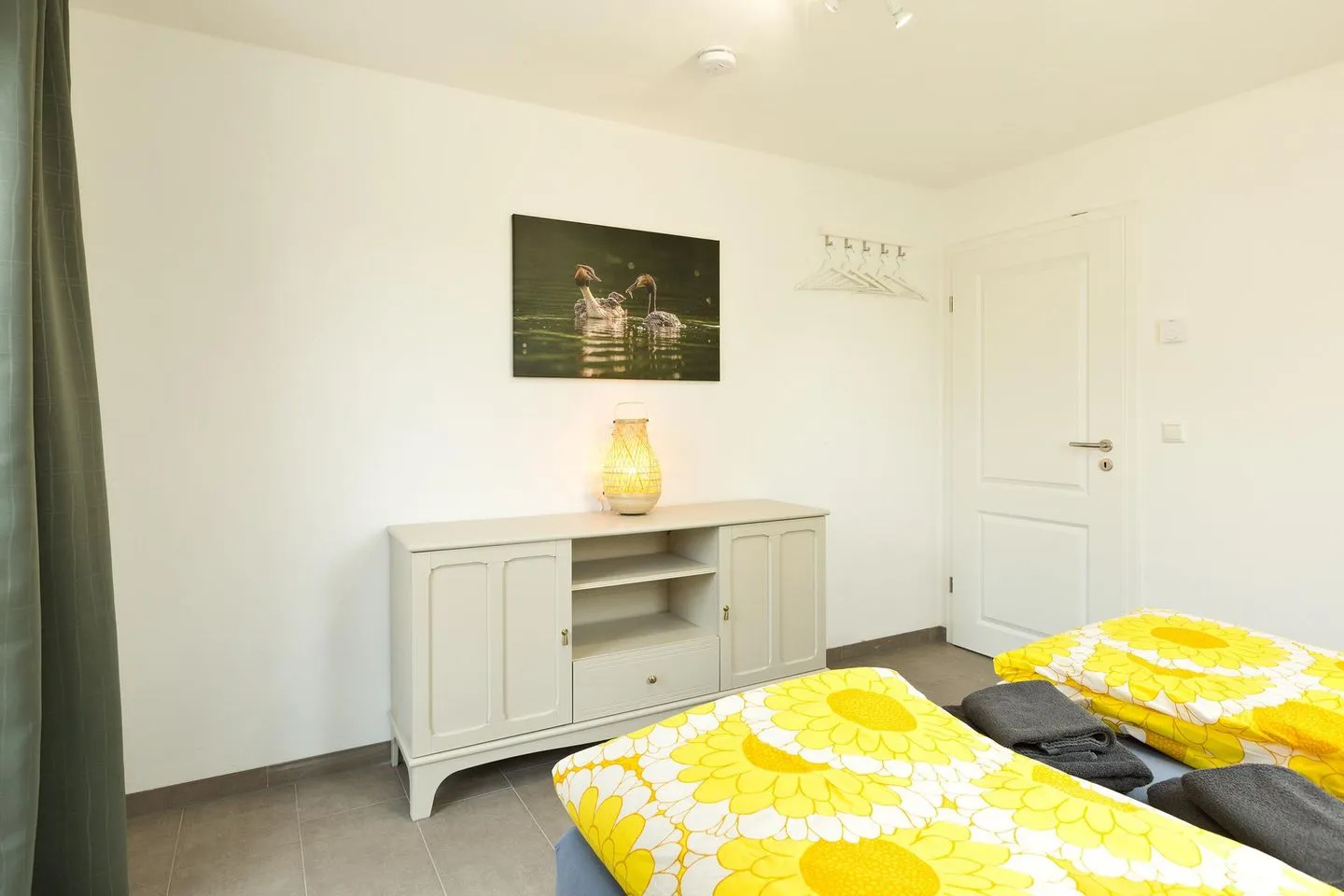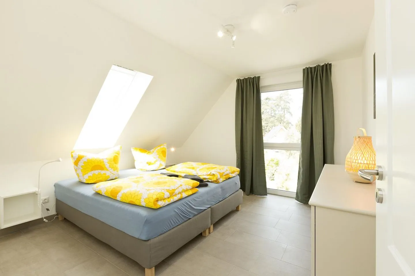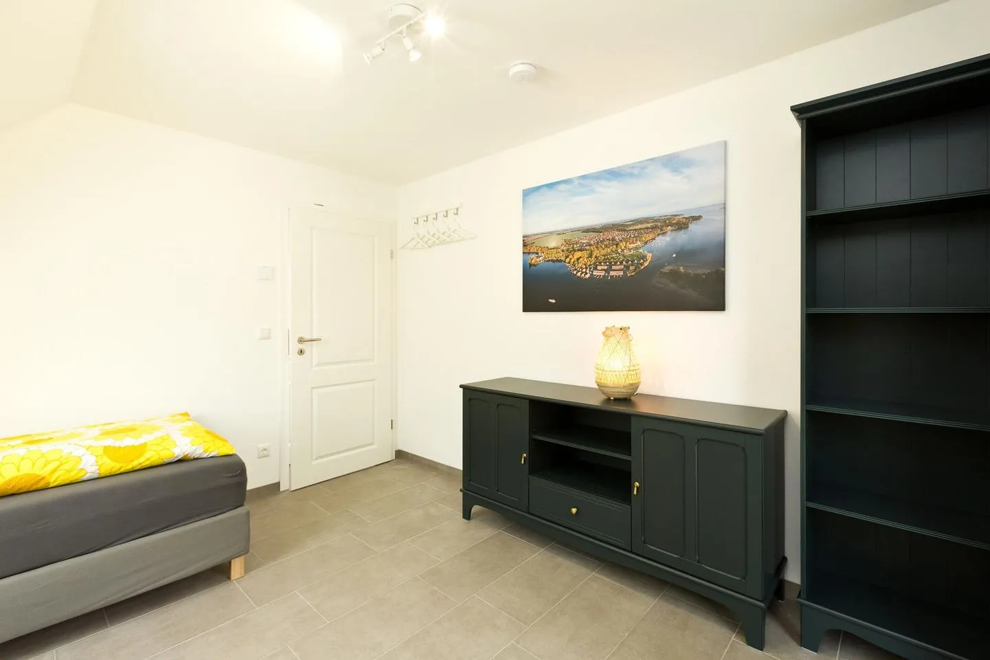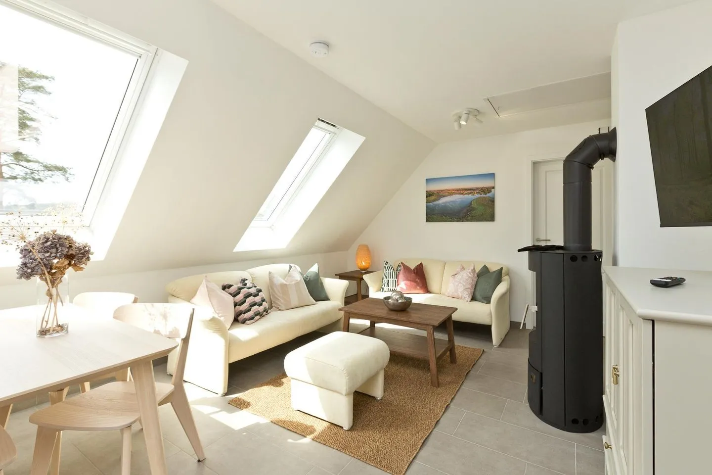 Die Ferienwohnung liegt im Obergeschoss. Geräumig und modern gestaltet. Mit großen Dachfenstern, die viel natürliches Licht hereinlassen. Die Wohnung verfügt über ein großzügigen Wohnbereich, einer voll ausgestatteten Küche, einem Bad mit ebenerdiger Dusche, einem Schlafzimmer mit einem Doppeltbett und einem weiteren Schlafzimmer mit zwei Einzelbetten. In dieser Ferienwohnung gibt es ausreichend Platz für bis zu 4 Personen.