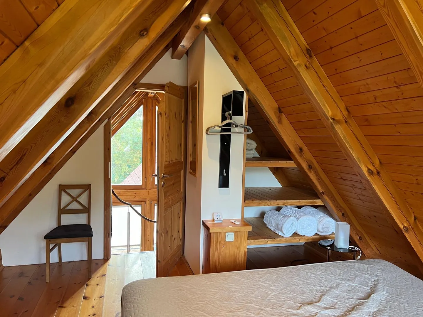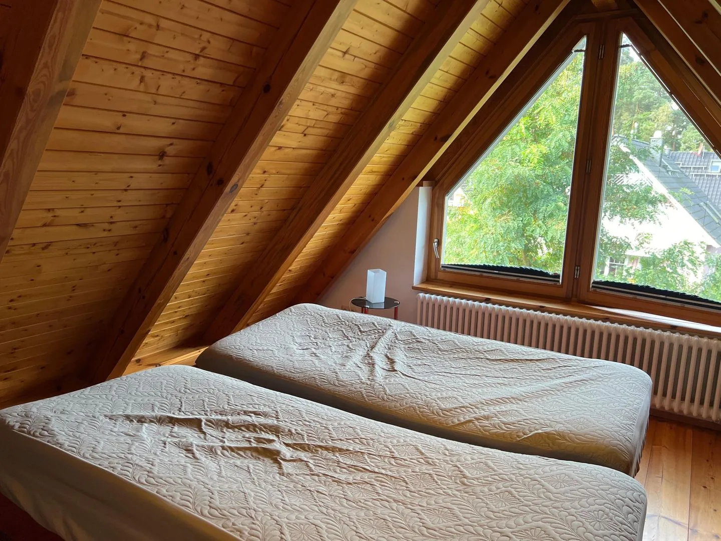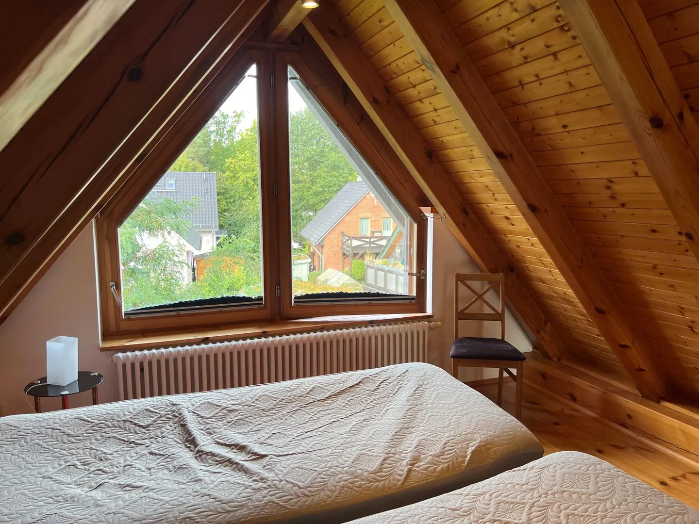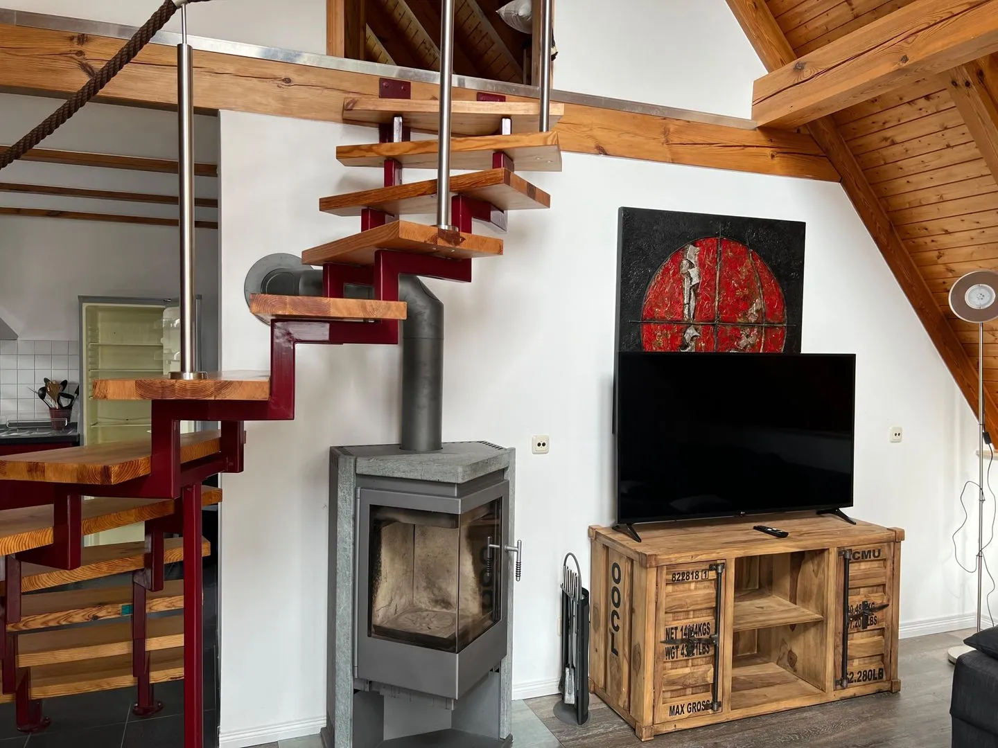 Die Ferienwohnung im Obergeschoss erreichen Sie über eine Außenwendeltreppe und bietet 2 Erwachsenen und einem Kind Platz. In dem großen kombinierten Küchen- und Wohnraum finden Sie eine vollausgestattete Hochglanzküche mit Geschirrspüler, Cerankochfeld, Backofen, Mikrowelle, Kühl-Gefrierkombination, Toaster, Wasserkocher und Kaffeemaschine, sowie einen gemütlichen Essplatz mit Musikanlage; kompatible für Smartphones. Im Wohnbereich steht ein Kaminofen sowie ein Flatscreen-TV und ein Schlafsofa sowie ein gemütlicher Ledersessel. Von hier führt eine Wendeltreppe nach oben in das komfortable Schlafzimmer mit zwei Einzelbetten. Das große Badezimmer mit Dusche und Eckbadewanne lädt zum Entspannen ein. Zusätzlich gibt es einen Abstellraum mit Waschmaschine. WLAN und ein PKW Parkplatz steht Ihnen kostenfrei zur Verfügung.